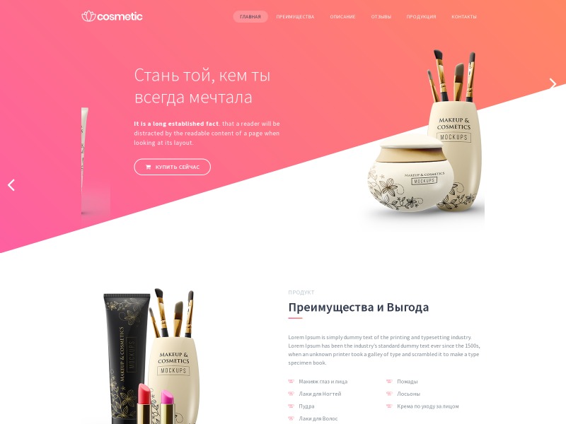 Одностраничный сайт для рекламы вашей косметической продукции: крема по уходу за кожей, шампуни, декоративная косметика и многое другое. На сайте размещены: