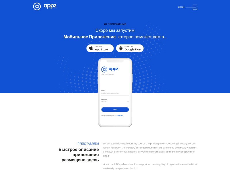 Одностраничный сайт для стартапа мобильного приложения. На сайте размещены: